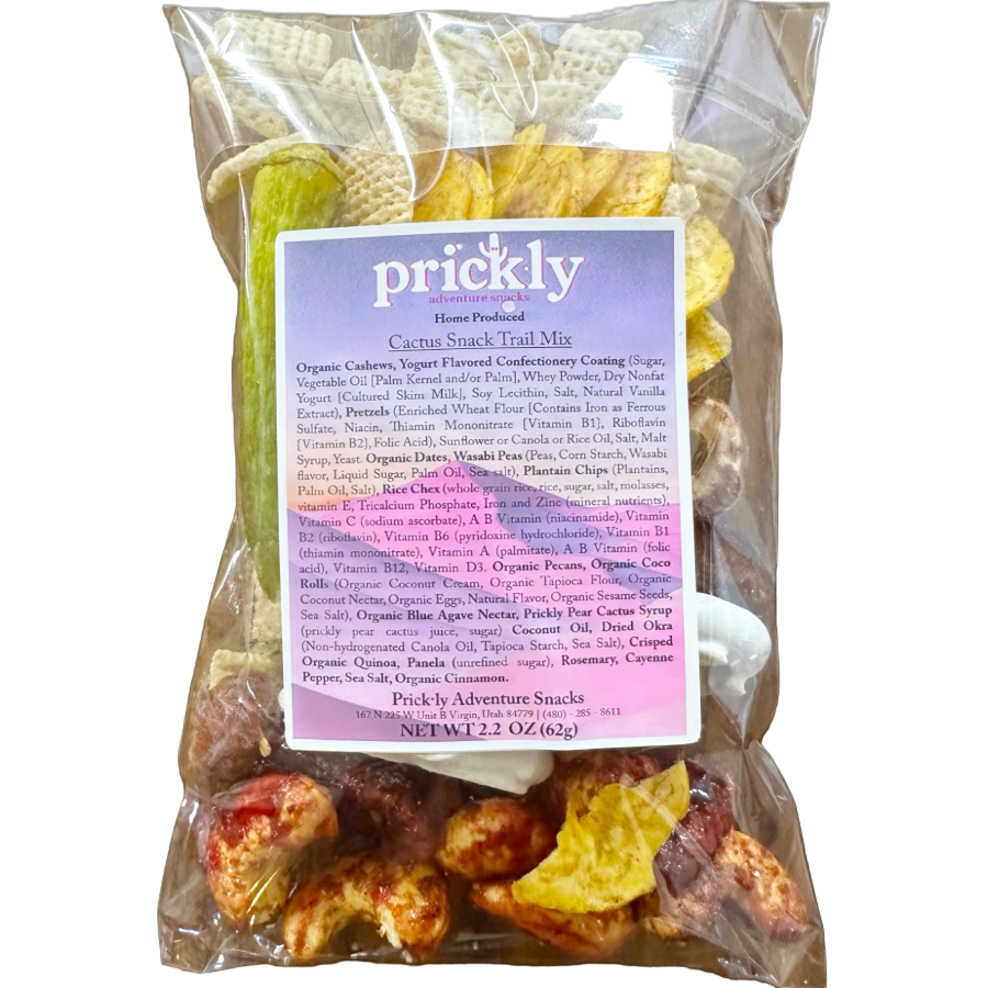 INGREDIENTS: Organic Cashews, Yogurt Flavored Confectionery Coating (Sugar, Vegetable Oil [Palm Kernel and/or Palm], Whey Powder, Dry Nonfat Yogurt [Cultured Skim Milk], Soy Lecithin, Salt, Natural Vanilla Extract), Pretzels (Enriched Wheat Flour [Contains Iron as Ferrous Sulfate, Niacin, Thiamin Mononitrate {Vitamin B1}, Riboflavin {Vitamin B2}, Folic Acid), Sunflower or Canola or Rice Oil, Salt, Malt Syrup, Yeast. Organic Dates, Wasabi Peas (Peas, Corn Starch, Wasabi flavor, Liquid Sugar, Palm Oil, Sea salt), Plantain Chips (Plantains, Palm Oil, Salt), Rice Chex (whole grain rice, rice, sugar, salt, molasses, vitamin E, Tricalcium Phosphate, Iron and Zinc (mineral nutrients), Vitamin C (sodium ascorbate), A B Vitamin (niacinamide), Vitamin B2 (riboflavin), Vitamin B6 (pyridoxine hydrochloride), Vitamin B1 (thiamin mononitrate), Vitamin A (palmitate), A B Vitamin (folic acid), Vitamin B12, Vitamin D3. Organic Pecans, Organic Coco Rolls (Organic Coconut Cream, Organic Tapioca Flour, Organic Coconut Nectar, Organic Eggs, Natural Flavor, Organic Sesame Seeds, Sea Salt), Organic Blue Agave Nectar, Prickly Pear Cactus Syrup (prickly pear cactus juice, sugar) Coconut Oil, Dried Okra (Non-hydrogenated Canola Oil, Tapioca Starch, Sea Salt), Crisped Organic Quinoa, Panela (unrefined sugar), Rosemary, Cayenne Pepper, Sea Salt, Organic Cinnamon.