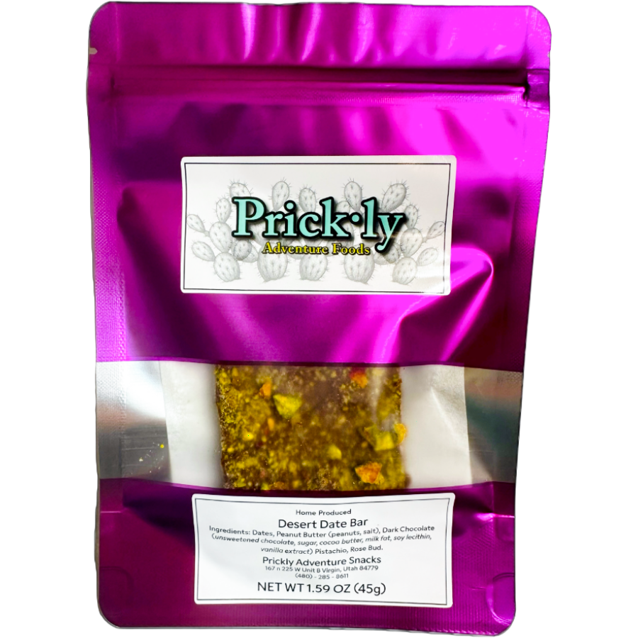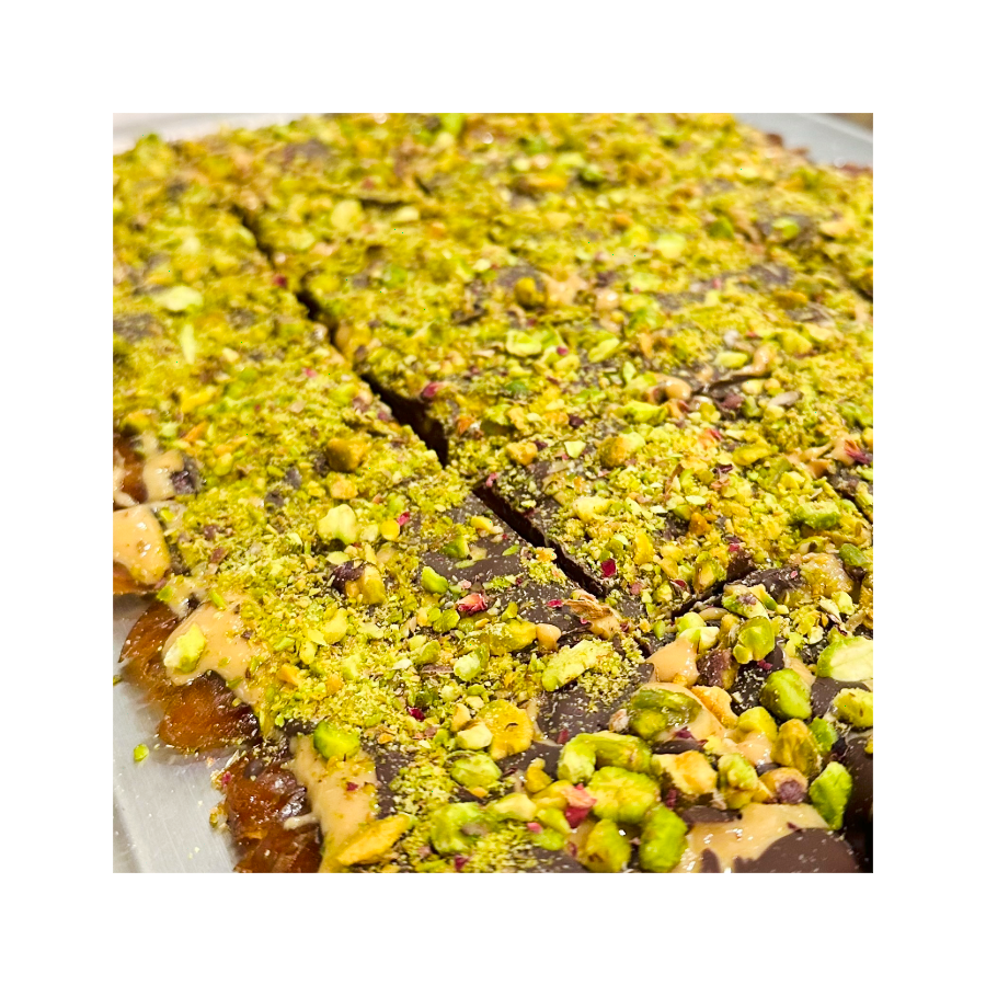 Ingredients: Dates, Peanut Butter, Dark Chocolate (unsweetened chocolate, cane sugar, cocoa butter, milkfat, soy lecithin, vanilla extract), Pistachio, Rose Bud.